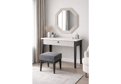 • Боковые царги: ЛДСП 2,2 см, передняя панель — МДФ с декоративной фрезеровкой в виде вертикальных полос и окутана плёнкой ПВХ;